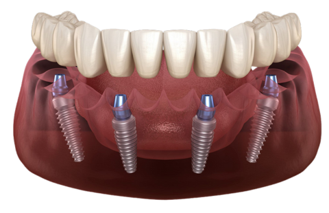 Na maioria dos casos, utilizamos de 4 a 6 implantes para sustentar a prótese inteira, o que permite reabilitar todos os dentes da arcada com estabilidade total